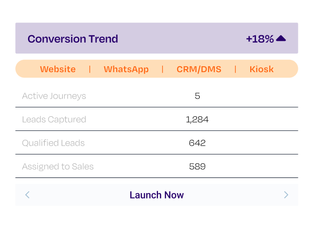 Once configured, DaveAI plugs into your website, apps, WhatsApp, kiosks and CRM/DMS. Journeys go live with tracking in place so you can see how many leads are captured, qualified and handed off to your sales teams and keep optimizing over time.